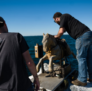 Our first challenge, of course, was the weather and tide. The Graves is an inhospitable place even on a nice day. A small breeze can create havoc. The island is really only a jumble of rocks that are exposed at low tide. There is no dock and no way to easily disembark. The captain of the landing craft just nosed his boat against the rocks and told us "It's now or never." We hauled the 200+ pound metal horse up onto the rocks with a few scraped fingers and bruises. There would be many times during the day where we were lucky to not die.